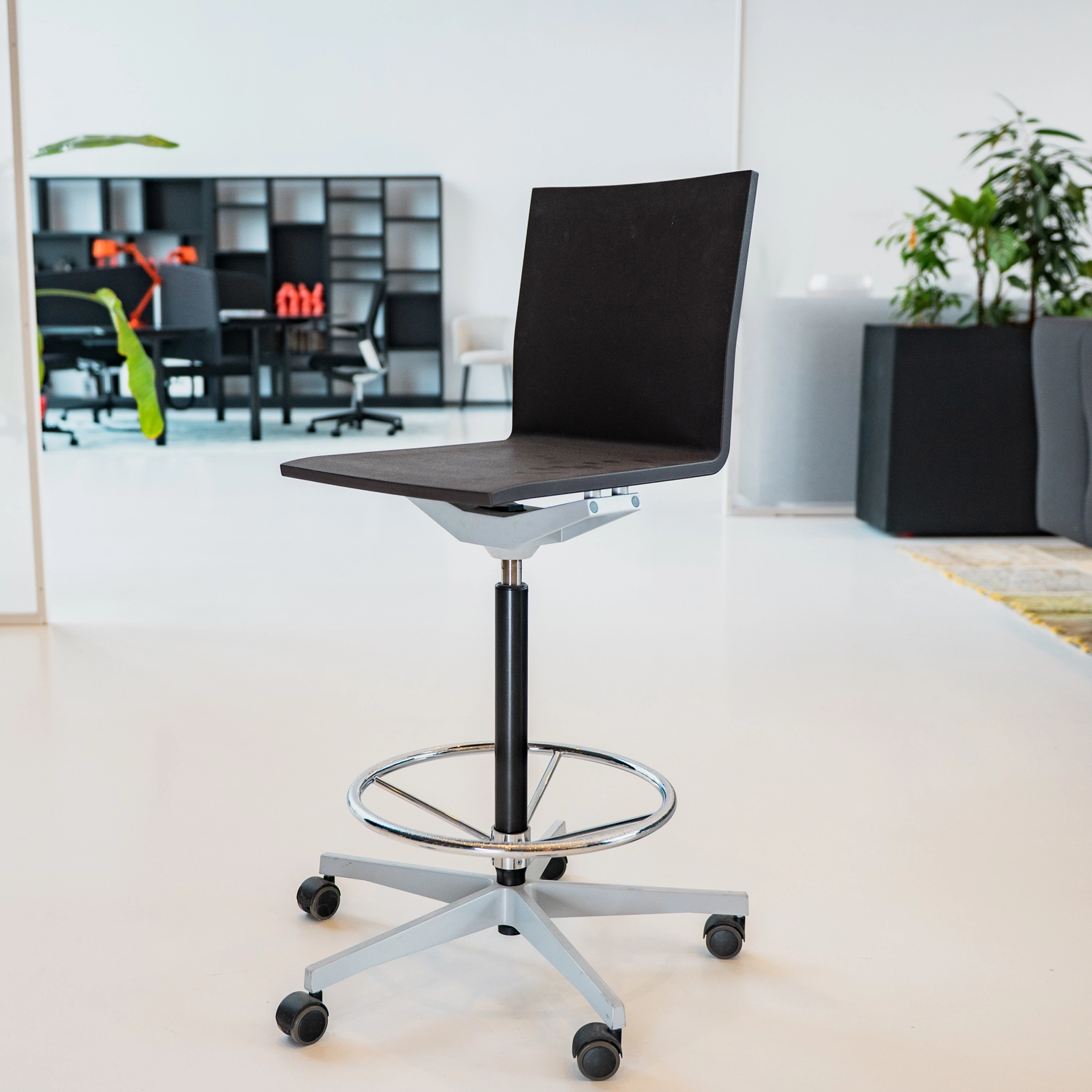 De Vitra .04 Counter biedt minimalistisch comfort met flexibele rugleuning (geïntegreerde bladveren voor veerkracht) en integral foam zitschaal (polyurethaan met leder-effect, zelfdragend stalen frame) in zwart, plus geïntegreerde armleuningen van integral foam. Micro-mechanisme met rubber baljoint voor multi-directionele beweging, gaslift hoogteverstelling (68-79.5 cm zithoogte) en gepoedercoat aluminium 5-ster base (silver RAL 9006) met zachte wielen en footrest. Afmetingen: 56.5 x 49-53 x 107.5-119 cm (BxDxH); ideaal voor countertafels, standing desks, vergaderruimtes of showrooms als discreet designobject. Dit betreft een demomodel – op=op!
