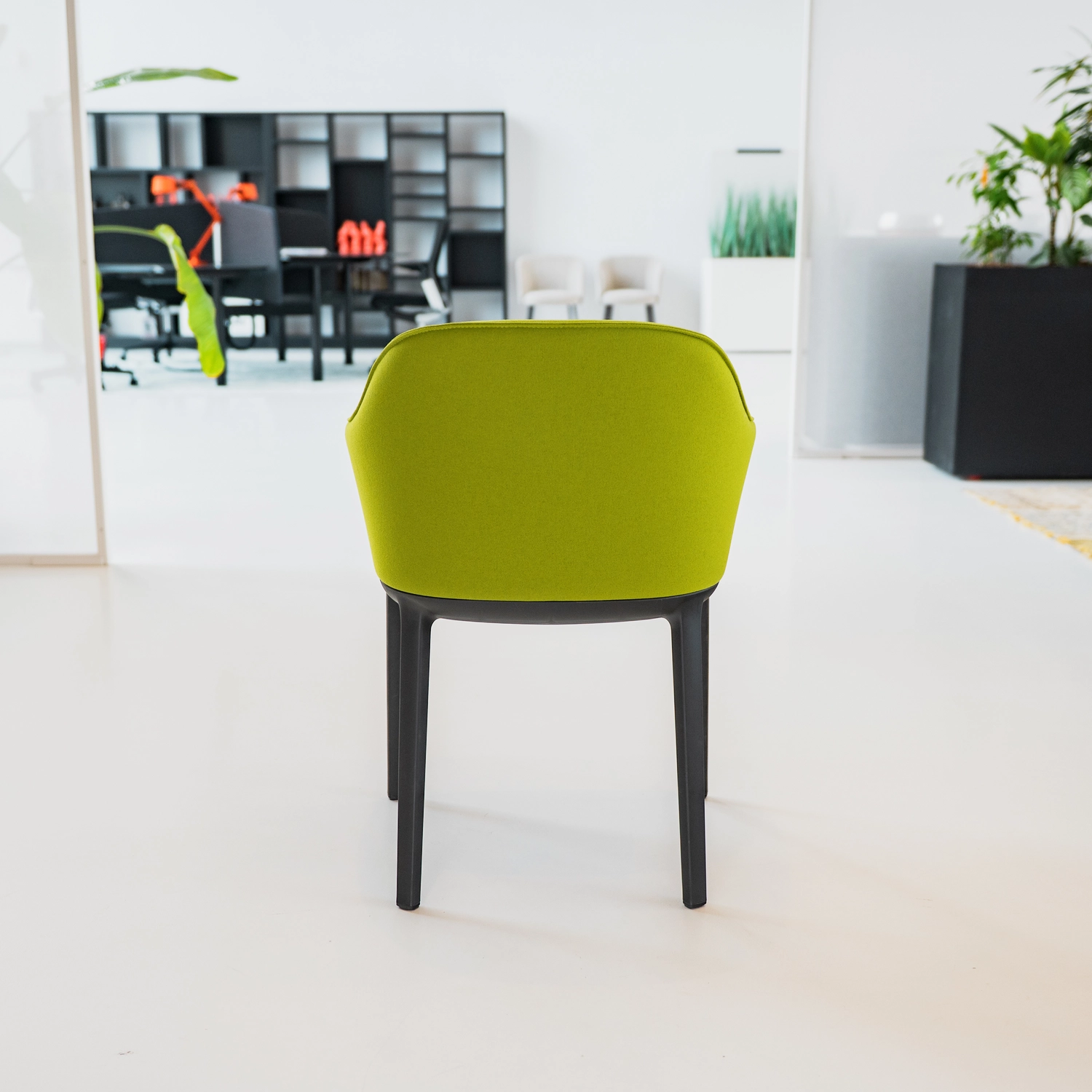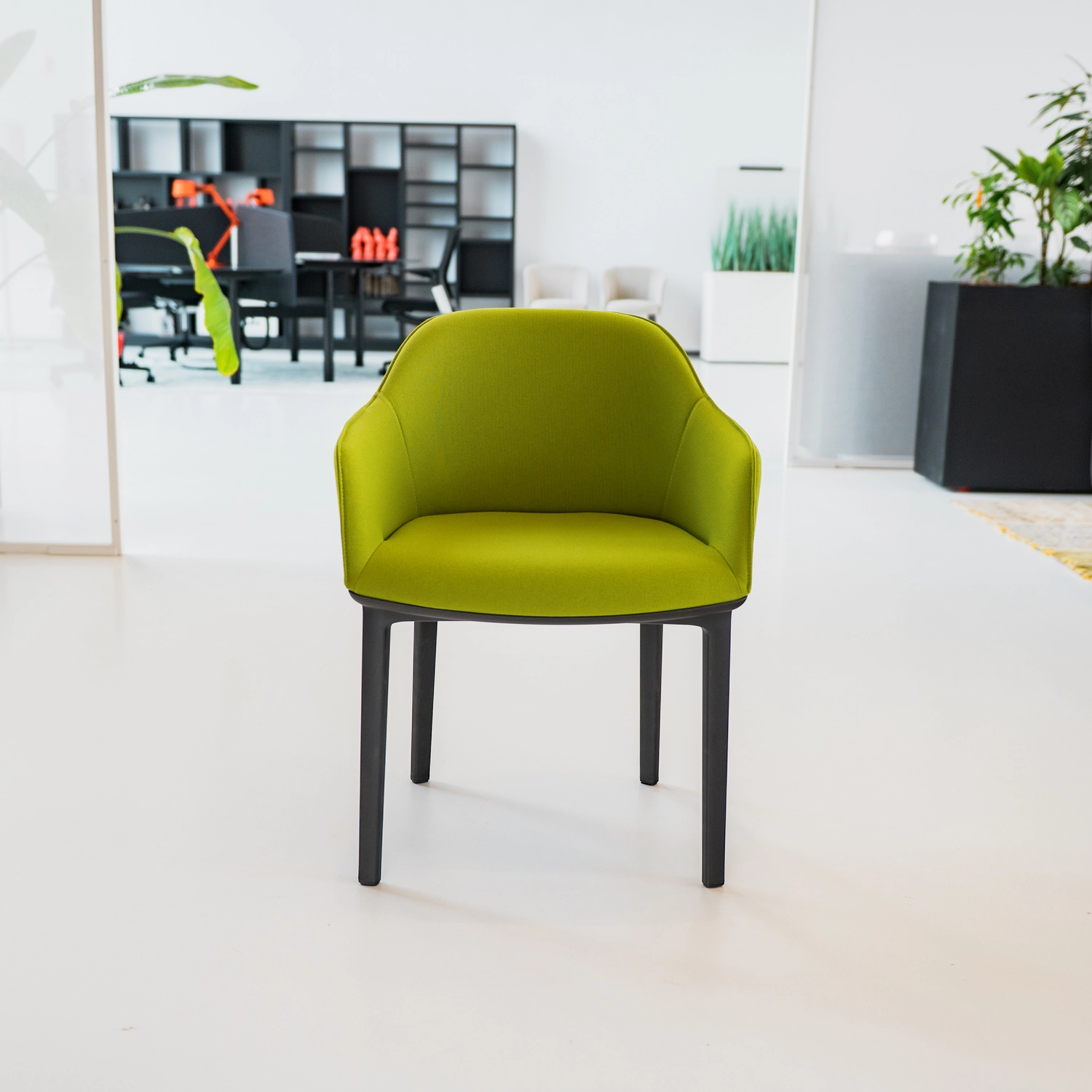 De Vitra Softshell Chair biedt superieur comfort dankzij verticale ribben in de glasvezelversterkte polyamide rugschaal die zich aanpassen aan de gebruiker, met volledige polyurethaanschuim bekleding in groene stof voor een knusse uitstraling. Geïntegreerde armleuningen en vierpotig onderstel in basic dark (afmetingen: 62 x 56,2 x 81,5 cm, zithoogte 44 cm, zitdiepte 47 cm); niet stapelbaar, ideaal voor vergaderruimtes, kantoren of lounges.